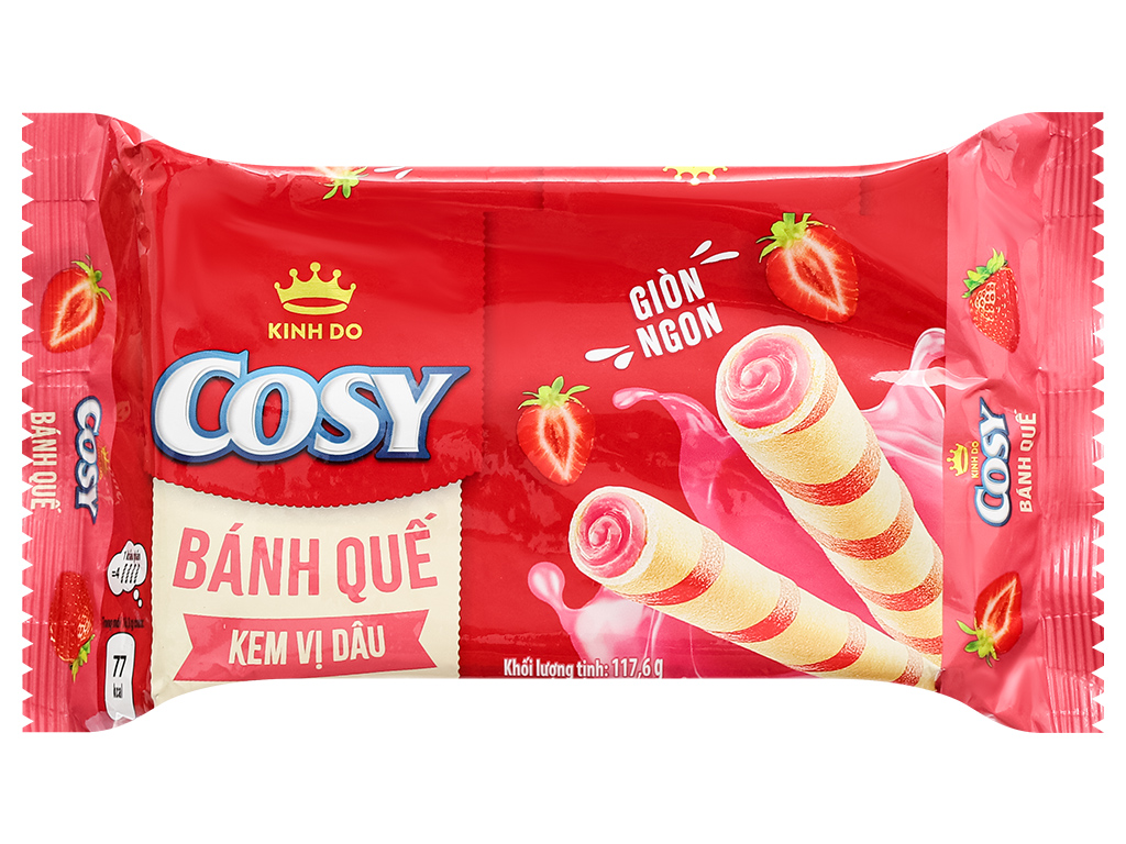 Cosy វ៉ាហ្វែលក្រែមស្ត្របឺរី ជានំស្រួយឆ្ងាញ់ មានស្រទាប់ក្រែមផ្អែមរសជាតិស្ត្របឺរីនៅខាងក្នុង។ មានរសជាតិផ្អែម និងស្រួយ ងាយញ៉ាំ។