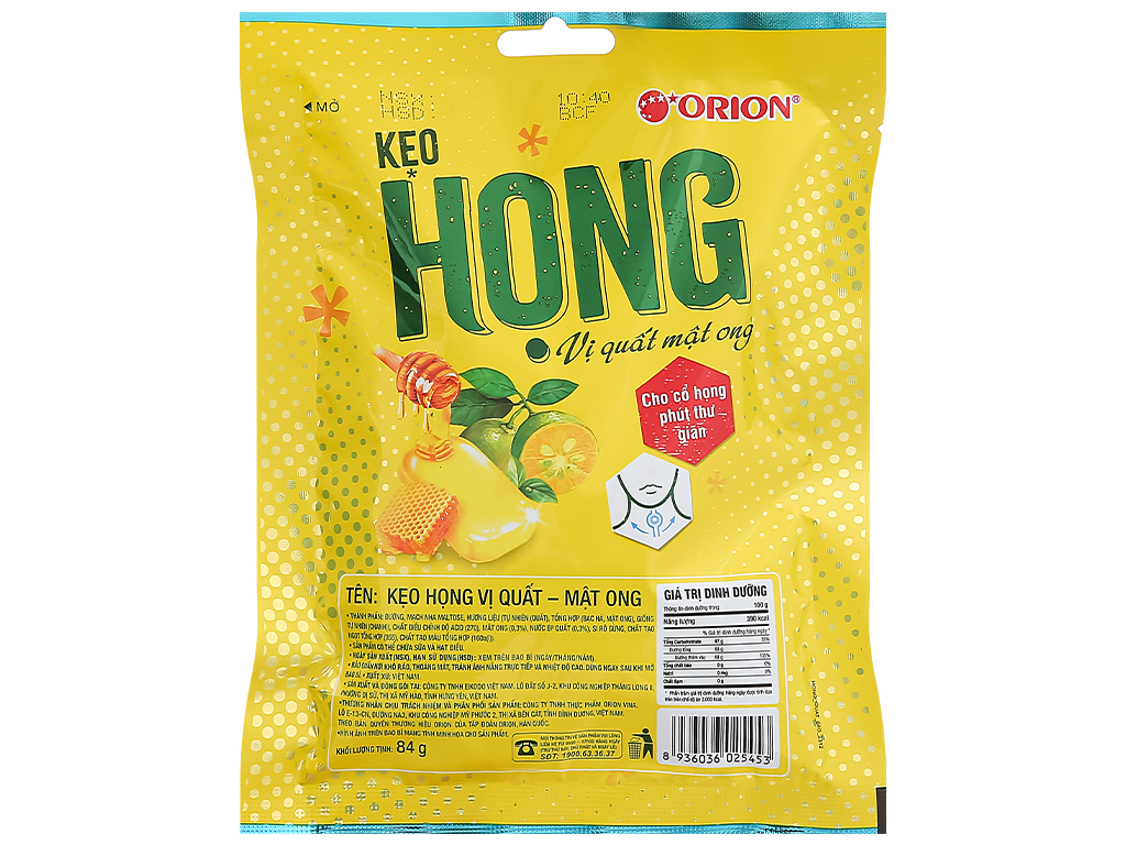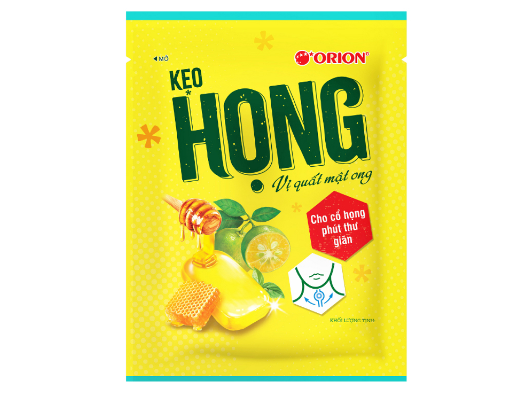 ស្ករគ្រាប់ Orion រសជាតិទឹកឃ្មុំ និងក្រូចសើច ជួយផ្តល់អារម្មណ៍ត្រជាក់ស្រស់ស្រាយ និងបន្ធូរបំពង់ក។ មានរសជាតិផ្អែមបន្តិច និងជូរបន្តិច។