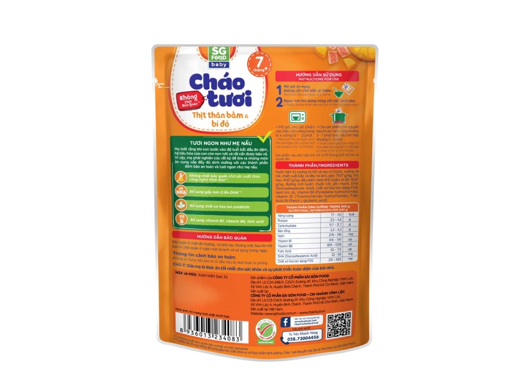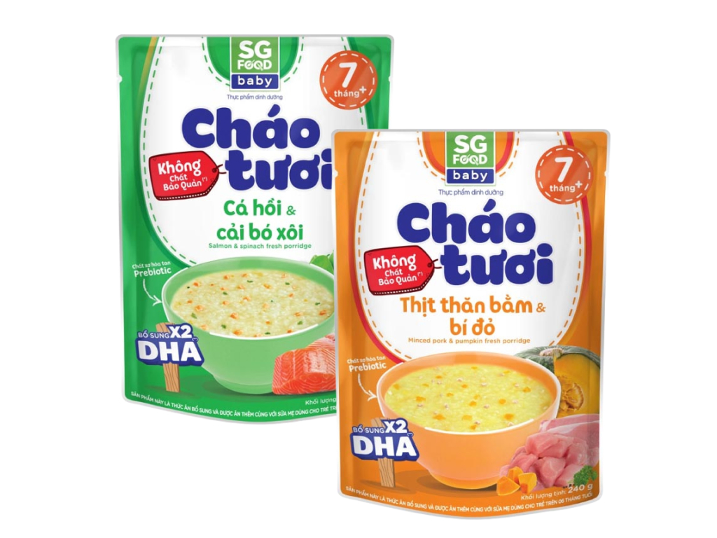 SG Food Baby Fresh Porridge Salmon, Spinach, Minced Pork & Pumpkin 240g is a nutritious ready-to-eat baby porridge made from salmon, spinach, minced pork, and pumpkin.