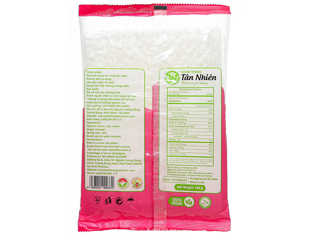 Tan Nhien Super Thin Rice Paper (16cm x 22cm, No Water Needed, 120g) is a type of ready-to-use rice paper used for making fresh or fried spring rolls.